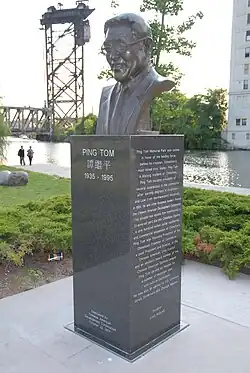 Following his sudden death in 1995 due to pancreatic cancer, Tom's wish that a park be built for Chinatown residents came true on October 2, 1999, when the Chicago Park District dedicated the 12-acre (49,000 m2) Ping Tom Memorial Park next to the Chinatown Square in his name. In 2005, a bust of Tom was installed in the park to commemorate the 10th anniversary of his death.