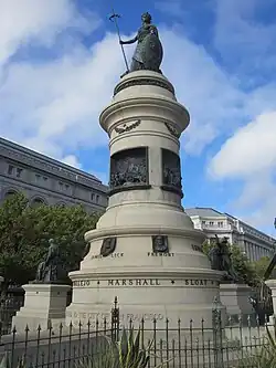 The Pioneer Monument is a granite monument supporting bronze figures and reliefs created by Frank Happersberger and financed by the estate of James Lick. It is located on Fulton Street between Hyde and Larkin streets in the Civic Center of San Francisco, California, next to the San Francisco Public Library. It was dedicated on November 29, 1894.[1] A highly controversial component, Early Days, was removed in 2018.