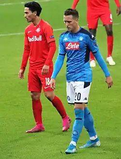 On 21 August 2021, he sustained a quadriceps injury in a match against Venezia (2–0), which prevented him from playing in the next match against Genoa.[66] On 23 September 2021, he returned to the starting lineup and scored his first goal in the 2021–22 Serie A season in a 4–0 victory over Sampdoria.[67] On 26 September 2021, he registered an assist in Napoli's 2–0 victory over Cagliari and repeated this in the next match on 3 October against Fiorentina (2–1).[68] On 31 October 2021, not only did he decide the derby between Salernitana and Napoli, scoring the only goal of the game, but with 32 goals he also became the second best Polish goal-scorer in Serie A's history (behind Arkadiusz Milik), beating Zbigniew Boniek's record.[69] On 17 February 2022, he scored a goal for Napoli in a Europa League match against Barcelona which ended in a 1–1 draw.[70] On 15 August 2022, he scored against Hellas Verona contributing to his side's 5–2 victory at the Stadio Marcantonio Bentegodi.[71]