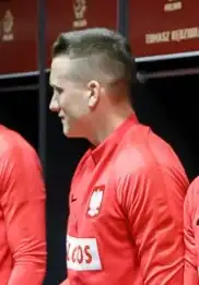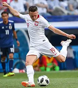 On 27 March 2018, he scored a goal in a friendly match against South Korea, which concluded in Poland's 3–2 win.[85] In May 2018, he was named in Poland's preliminary 35-man squad for the 2018 World Cup in Russia.[86] On 7 September 2018, he scored a goal after an assist from Robert Lewandowski against Italy in a UEFA Nations League match that ended in a 1–1 draw.[87] On 10 June 2019, he registered an assist to Kamil Grosicki's goal in a UEFA European Championship elimination match against Israel contributing to a 4–0 victory for Poland.[88]