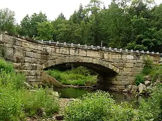 The Pithole Stone Arch Bridge is a segmental arch bridge, spanning 37 feet (11 m) over Pithole Creek. The bridge is unusual for its short span and a flat arch that rises only 6 feet 7 inches (2.0 m). Also unusual are the bridge's massive abutments and for its being well-built for only a rural backroad.[7] The bridge was constructed using ashlar that was "coursed", meaning each successive layer of stone had a different height, but the stone in each layer had the same height.[8] A total of 628 square perches (15,543 ft2; 1,444 m2) of sandstone were used in the bridge.[4]
