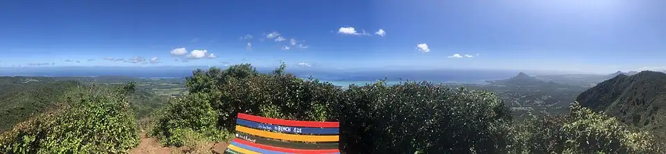 The summit of Piton de la Petite Riviere Noire can be reached by various paths, the most common route is from Plaine Champagne, however there are routes from Chamarel and also from the Black River Gorges Visitors centre. On the summit there is a bench called "Bench 828".