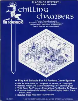Places of Mystery I: Chilling Chambers is a supplement descripting various indoor settings that can be used by gamemasters to supplement their role-playing adventures.[1] Ten rooms are described, from the mundane (kitchen, army barracks) to the exotic (alchemist's lab, jail). Floor plans scaled for 25 mm miniatures are provided for each room. The book also includes descriptions of six traps and four poisons.[2] Chilling Chambers does not use the rules for any particular role-playing game such as Dungeons & Dragons or RuneQuest, leaving the gamemaster free to use the material with any role-playing game.