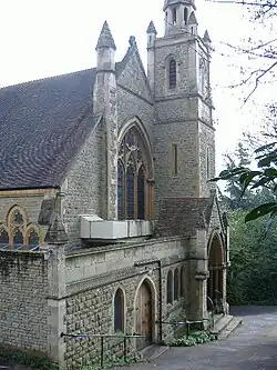All Saints remains as one of two C of E churches in Malvern Wells following the closure of St Peter's Gothic style church designed by Robert Jearrad (1836).[6] Built in 1930 in 13th-century style in Malvern rag-stone by architect Troyte Griffith of Nevinson & Newton,[6] to whom Sir Edward Elgar dedicated an Enigma Variation,[7] it is located on steep sloping common land donated by Lady Emily Foley, it has a semicircular apsidal chancel which demonstrates the architectural challenges of east-facing chancels on the flanks of the Malvern Hills, and an organ by Nicholsons.