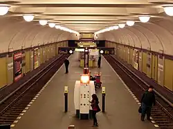 The station was designed by Alfred Grenander. For topographic reasons, it lies unusually deep underground and the station was therefore constructed with an unusually high vault and long platform.[1] Grenander made exceptionally expressive use of the play of light and shadow in the vaulting and its supports.[2] It is one of only 2 Berlin U-Bahn stations with no central columns, the other being Märkisches Museum.[3] It is tiled in grey with black accents.[1]