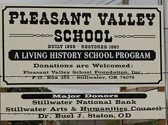 The Pleasant Valley School building is an example of a one-room country school that was common throughout Oklahoma during the late 1800s and early 1900s. The building was built in 1899 and continued to function as a one-room school until 1941. It remains the only extant one-room, frame school building in Payne County. It is one of the very few in Oklahoma still located on its original site and still playing the role of an educational and social center.[1][2]