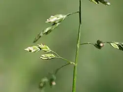 The panicle is open and triangular shaped, 5–7.5 cm (2–3 in) long. The spikelets are stalked, awnless, 1–2 cm (0.4–0.8 in) long when flowering, and loosely arranged on delicate paired or spreading branches. Sometimes they are tinged purple.