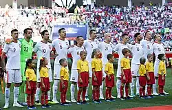 The Polish drew a group featuring hosts South Korea, the United States and Portugal.[78] The first match was played against the hosts on 4 June, with Poland losing 2–0.[79] The second game was against Portugal on 10 June, which Poland lost 4–0, confirming their early elimination.[80] Poland then played the United States in the final group game on 14 June, winning 3–1; however, the U.S. advanced to the quarter-finals after defeating Mexico in the round of 16.[81] Despite the win, Poland finished last in the group, with a goal difference of –4 and 3 points.[10]