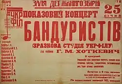 Concert poster of Poltava Bandurist Capella under the artistic direction of Hnat Khotkevych from January 1930