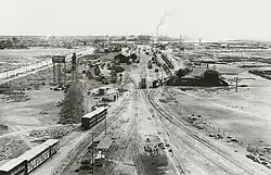 | In 1967, 91 years after its construction, everything around the original Port Pirie South building had changed, including new standard-gauge tracks serving the just-opened Mary Elie Street station (left). | Track layout of Port Pirie South in the 1920s – all narrow-gauge. Broad and standard gauges were added in 1937. |