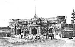 The gate at the beginning of the 20th century: one can see the two side arches, which were opened during the 19th-century Habsburg transformations, and the tramway line that led from the railway station to the city center
