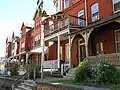 Built in 1890, these historic structures are three-story brick buildings that were designed in the Queen Anne style. They feature mansard roofs with terra cotta shingles, front porches, and projecting three-story bay windows. The house that is located at 3314-3316 Arch Street has a corner tower.[2]