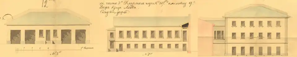 One wing was supposed to be of three storeys with six doors on the ground floor, the other wing – one-storey - with four wide openings and a door in the center, most probably to be used as a coach-house. One of the proposals of the project suggested closing of the clear passage to the garden by means of creating an addition to the main building for it to occupy the whole plot. This project was approved, and the addition was built.[4]