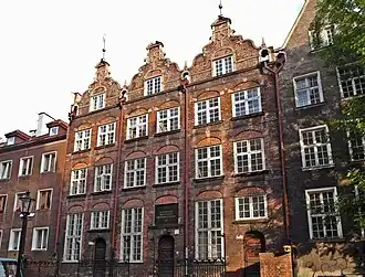 The house was constructed between 1599 and 1602 according to plans by a local architect, Anthonis van Obberghen.[2][4] Initially, it housed rooms for the Lutheran clergy serving in the nearby St. Catherine's Church.[2][4] The façade, one of the few in the area to survive World War II, is divided into three distinct parts, making the building look like three identical yet separate town houses.[2] This made the large building fit better with the surrounding narrow mediaeval town houses.[4] It was a common feature of many of van Obberghen's projects, notably the Grand Armoury and the Green Gate.[2] In front of the façade stands a characteristic gilded railing.[2]
