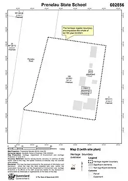 1. ^ a b c d e f g h i j k l m n o p q r s t u v w x y z aa ab ac ad ae af ag ah ai aj ak al am an ao "Prenzlau State School (entry 602856)". Queensland Heritage Register. Queensland Heritage Council. Retrieved 11 February 2018.