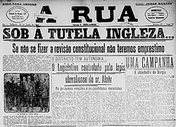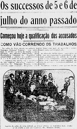 Its proponents argued that there was full freedom for discussion, while opponents considered it absurd to debate the proposal in the midst of a state of emergency, with newspapers suffering criminal prosecutions and journalists being arrested and attacked.[100] Jornal do Brasil, O Imparcial, Gazeta de Notícias and other newspapers critical of the government had copies seized and newsrooms raided.[101] For Correio da Manhã, the law established the crime of opinion, and for O Imparcial, the proposal was "the death of freedom of opinion in Brazil".[102] The repeal of the law would later be one of the tenentists' declared objectives.[103]