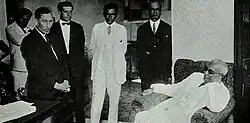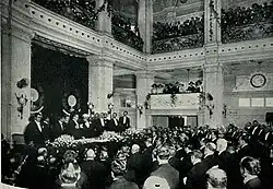 On 4 May, Bernardes and the entire ministry attended the golden jubilee of D. Arcoverde, the archbishop of Rio de Janeiro and first Brazilian cardinal — an unprecedented visit since the separation between the Catholic Church and the Brazilian State and a public exhibition of their rapprochement, which had already begun under the previous government.[141] Bernardes was personally distinguished by his Catholic religiosity, cemented by his secondary education at the Caraça School[142] — although, according to him, he was no longer a practicing Catholic in 1925, and only later resumed his religion.[143]