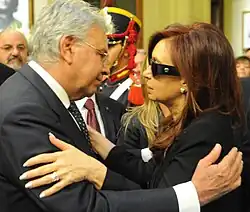 In September 2010, it was announced that Argentina was elected president of the Group of 77+China and prepared to act as a ‘bridge" with G-20 major economies to which it also belongs.[82] She visited Chile during their Bicentenary celebrations where she also assisted at the baptism of a Chilean baby, Anaís Escobar Maldonado, born in the Argentine Hospital deployed at Curico after the earthquake. The visit had a high profile in the media mainly because of the possible extradition to Chile of Sergio Apablaza. She met with president Sebastián Piñera and participated in the festivities at the national stadium.[83] She also confirmed the celebration of the III bi-national cabinet meeting for next October.[84][85] Fernández de Kirchner then departed for New York to give her United Nations General Assembly speech where she once again criticized Britain over the Falklands (Malvinas) issue, and Iran for the 1994 AMIA bombing whilst giving her support for an Israeli-Palestinian dialogue and an eventual Palestinian state.[86] On 30 September she hosted the UNASUR presidents' emergency summit at Buenos Aires due to the Ecuador crisis and started an official visit to Germany the following day in order to participate as a Guest of Honour at the Frankfurt Book Fair[87] and meet with Chancellor Angela Merkel. In October she inaugurates the III News Agencies World Congress to be held in Bariloche.[88] This same month, and as part of the 2006 civilian nuclear-power reactivation program, Fernández reopened the Pilcaniyeu uranium enrichment plant, put on ice in the 1990s, amid worsening shortages of natural gas.[89] Following the death of her spouse (see below), she also resumed activities and flew to South Korea for the G20 Seoul summit. After her return she announces that the Paris Club agrees to debt talks without the International Monetary Fund intervention as proposed by Argentina since 2008. These negotiations will result in the settlement of the last portion of the sovereign debt defaulted in the 2001 crisis after the successful restructuring debts of 2005 and 2009.[90] In November she also participated in the UNASUR Summit at Guyana after which will host the XX Ibero-American Summit at Mar del Plata.