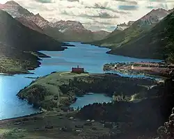 The Prince of Wales Hotel is one of Canada's grand railway hotels, and the only one built by an American company, Great Northern Railway. The hotel was designed by Thomas D. McMahon, with construction contracted to Oland and Scott Construction of Cardston, Alberta. The design of the hotel was also influenced by Louis W. Hill, the president of Great Northern Railway. Maintaining contact with McMahon, he critiqued designs submitted by McMahon, placing a particular importance of functionality.[1] Aside from functionality, he was a driving force in acquiring pictographs for the hotel from the Kainai Nation. An admirer of the Blackfoot culture, he prominently used native imagery as a marketing tool for his company.[2] Hill was also the first to suggest the installation of power plugs in the guest rooms of the hotel for the purpose of clothes irons and curling irons.[1] The hotel was designated as a national historic site of Canada on 6 November 1992.[3]