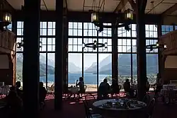The hotel building houses a number of guest rooms as well as two suites.[9] The hotel also hosts food-services in the building, including the Royal Stewart Dining Hall.[10] The formal dining hall features large windows overlooking Upper Lake Waterton, and hosts the restaurant's afternoon tea.[11] The Windsor Lounge is a cocktail lounge that was carved out of the east wing of the hotel in 1960, replacing the Maple Leaf Lounge. The lounge was placed in the east wing in order to prevent passers-by on Highway 5 from viewing inside the lounge.[12]