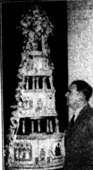 This three-tiered cake, mounted on a silver stand was made by F E Jacobs, chief decorator of J Lyons’ Ornamental Department. It stood 1.8 metres high and weighed 63 kg.[20]