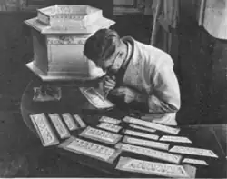 Details of the cake design were kept secret, with the Princess wishing that they “not be made known until the wedding day”.[32] However, the cake was put on private view for select visitors in their London factory on 15 November, where invited guests watched Frederick E Schur, the company's chief confectioner, put final touches to the decoration.[33] The day before the wedding, the cake was delivered to Buckingham Palace in a pantechnicon, escorted by a “courtesy cop” together with six men inside the van.[34]