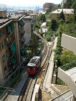 The Principe–Granarolo rack railway (Italian: Ferrovia Principe-Granarolo) is a rack railway in the Italian city of Genoa that connects via del Lagaccio, near the Genoa Piazza Principe railway station, to the Granarolo hills. The line is sometimes erroneously described as a funicular and listed alongside the city's Zecca–Righi funicular, the Sant'Anna funicular and the Quezzi funicular. The line is managed by AMT Genova, which manages the city's public transport.[1][2] It is a rare example of a rack railway operating within a city (others include the Dolderbahn and Stuttgart Rack Railway).