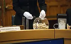 Under this method members who apply are drawn from a ballot and, if successful, are given parliamentary time for their bill. Members of Parliament who are successful in the ballot often have a higher chance of seeing their legislation passed, as greater parliamentary time is given to ballots than other methods of passing a PMB such as under the Ten Minute Rule. It is normal for the first seven ballot bills to get one day's debate each.[ 1]