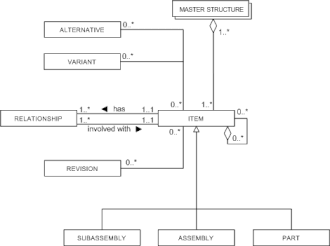 The core of the product structure is illustrated by the product components (items) and their relationships. Thus, this involves the linking between items related to the product. The assembly can consist of subassemblies and parts, whereas subassemblies can also consist of other subassemblies or part. Thus, this is typically hierarchically ordered. These concepts are generalized into the concept of item. This classification is overlapping, because a subassembly could be a part in another assembly configuration. Due to differentiation and variation of items several concepts must be indicated into the product breakdown structure. Three concepts are involved in this differentiation, namely alternatives, variants and revisions. An alternative of an item is considered as a substitute for that particular item, whereas a variant is another option of an item which the consumer can choose. When an error occurs at a part or subassembly, it needs to be revised. This revision indicates the change history of the item.