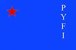 The length and breadth of the flag is 3:2, the colour of the flag is blue. There is a red star (★) in the top right corner of the flag, whichsymbolises "struggle", and on the right of the flag, "PYFI" is written vertically in white.
