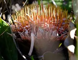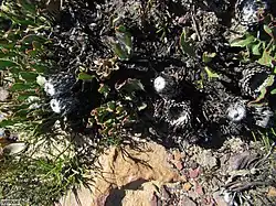 It produces underground rhizomes from which shoots bud off, especially after wildfires. The whole plant that emerges from these rhizomes can be up to 1 metre across. The seed is retained in the seed-head for a considerable time, before being released and scattered by the wind. Each flower has both male and female parts. Pollination occurs through the action of rodents. It grows on Cederberg shale, sometimes on sandstone soils at altitudes varying from 450 m to 1,800 m.[2][3]