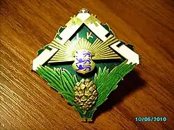 This Medal was granted in three ranks by the Council of Protection of Natural Amenities. This is a rhombus-shaped badge (in gold, silver or bronze, respectively to the rank) with green enamel, representing small State Arms with rays and letters LK (Looduskaitse), bordered by the gable of an Estonian farmhouse above, and a pine-cone with needles below. Medal exists in full size, worn in right breast, or in miniature, worn in left buttonhole.