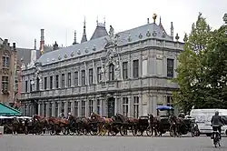 The current building dates from 1665 to 1666 and was designed by Antwerp architect Cornelis Verhouven and canon Frederic Hillewerve (also from Antwerp). It was built in the triumphal Baroque style typical of the Counter-Reformation. The pronounced baroque style is typical of 17th-century Antwerp Baroque architecture and is unique in Bruges city centre. The huge door was an entrance way for horses and carriages. Lady Justice can be seen above and the Greek gods of truth, charity and justice can be seen on the top pediment. The elaborate carving is the work was Bruges sculptor Cornelis Gailliaert.[2][3]