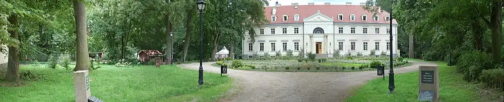 Landmarks of Przelewice are the Dendrological Garden in Przelewice with the palace and the medieval Regina Mundi church.