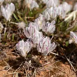 Ptilotus erubescens, commonly known as hairy heads or hairy tails,[2] is a species of flowering plant in the family Amaranthaceae and is endemic to south-eastern continental Australia. It is an erect, hairy perennial plant with linear to broadly linear stem leaves and white, grey or pink-tinged, spherical or oval spikes of flowers.