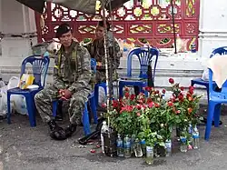 The first public protest after the coup attracted between 20 and 100 protesters, depending on the source. [20] [21] [22] [23] [24] [25] It occurred in front of Siam Center on the evening of Friday 22 September 2006. Nobody was arrested but a deputy commander said: "police had recorded the protest on video and would examine the tape to see if protesters had broken martial law forbidding an assembly of more than five people for political purposes." It is unknown whether the police or junta will later arrest those it has recorded breaking martial law on video.[26] Demonstrators wore black to mourn the death of democracy, and urged people who opposed the coup to also wear black in protest.[26] Signs included "No to Thaksin. No to coup" and "Don't call it reform - it's a coup". One poster depicted the Democracy Monument with the caption "On vacation again". Among the protesters was political scientist Giles Ungphakorn who noted, "We believe we speak for a significant number of Thais who are too worried or too afraid to speak." The protest was not reported on Thai television channels. The Independent reported that when the first protester, a female student, began reading out a statement, armed police forced their way through the crowd and grabbed her. The newspaper also reported that a police officer jabbed a gun into her stomach and told her: "You're coming with us." The protesters tried to hold the woman back, but her fate is unknown.[27]