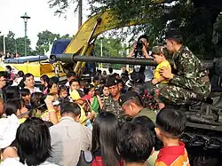 In the days following the coup, many Thai people in Bangkok and surrounding area supported the soldiers in their positions by bringing food, drinks, and flowers. In the following days, the presence of M-41/A tanks became an attraction for Thai adults and children as well as foreign tourists queuing up to take photos. At the Royal Plaza, a particularly big crowd turned the place into a temple fair with food vendors. Some schools have taken students on tours of the area [6]