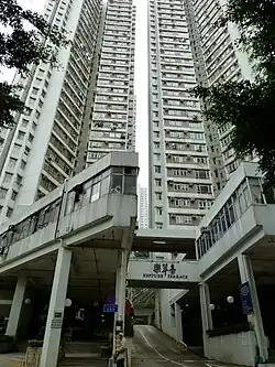 Fung Wah Estate (Chinese: 峰華邨) is a mixed public/TPS estate on a hill in southwest Chai Wan.[12][13] It consists of 2 residential blocks completed in 1991. Another HOS court, King Tsui Court (Chinese: 景翠苑), is also located in the estate. In 2000, some of the rental flats were sold to tenants through Tenants Purchase Scheme Phase 3.[14][15]