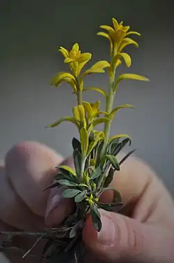 The pseudoflowers are borne from basal leaf rosettes of the host mustard and mimic the yellow, early spring corollae of distantly related wildflowers (e.g. buttercups), not only in visible light but also in ultraviolet.[4] Since bees and many pollinating insects "see" in the ultraviolet range, these pseudoflowers are highly attractive. In addition, the fungus produces a distinct scent to attract insects; this olfactory appeal has allowed the fungus to evolve and "improve" upon the mimicry system by facilitating proper transfer of fungal spermatia.[5] The bees feed on a sweet, sticky substance similar to nectar that the fungus forces the plant to produce on the imitation flowers.[6]