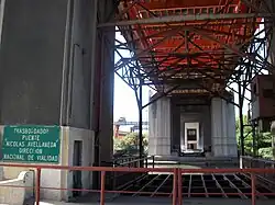 Puente Nicolás Avellaneda is a 1650-metre long liftable road bridge with 2 lanes in Buenos Aires, Argentina over Riachuelo River, which was built from 1937 to 1940.[1] The 57 metre tall liftable section over the river has a length of 60 metres and offers a clearance of 43 metres when lifted, and a clearance of 21 metres when not lifted. This section of the bridge carries a transporter gondola and can work like the nearby Puente Transbordador as a transporter bridge. The transporter gondola was designed to allow horse-driven wagons to cross the river without using the long strenuous way over the ramps of the bridge. Puente Nicolás Avellaneda is the only liftable bridge in the world equipped with a transporter gondola. However since 1960, this gondola is only in use when the roadway on the bridge is closed for maintenance work.