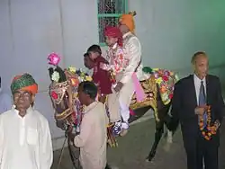 Groom riding a horse with his sarbala