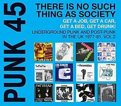 Punk 45: There Is No Such Thing As Society is a compilation that was a follow-up to Soul Jazz Records' album Punk 45: Underground Punk in the United States of America, Vol. 1 (2013).[1][2] This album focuses on punk rock and post-punk music released between 1977 and 1981 that was not as popular as other groups of the era such as The Clash and The Sex Pistols.[1]