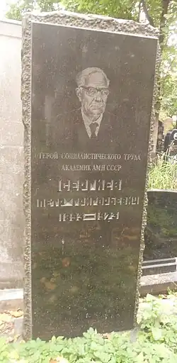 Sergiev died on 12 July 1973, two days after his 80th birthday. He was buried at the Novodevichy Cemetery in Moscow.[13] He was survived by his son Vladimir (born 1943), a parasitologist and Fellow of the Russian Academy of Sciences, and grandson Pyotr (born 1973), a molecular biologist and a Fellow of the Russian Academy of Sciences.[5]