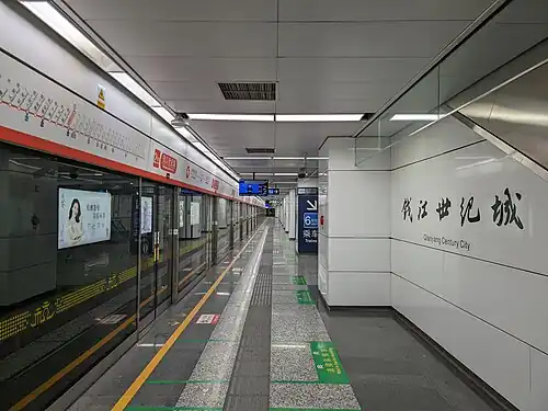 Qianjiang Century City (Chinese: 钱江世纪城) is a metro station on Line 2 and Line 6 in China.[1] It is located in the Xiaoshan District of Hangzhou. The Line 2 part of the station was opened on 28 April 2016.[2] The Line 6 part of the station was opened on 30 December 2020.[3]