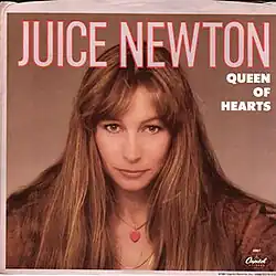 Following an appearance on the 1980 Rodney Crowell album But What Will the Neighbors Think, on which composer DeVito played guitar, "Queen of Hearts" had its highest-profile rendition in a version by country-rock singer Juice Newton from the 1981 album Juice. Newton would later recall: "I did ['Queen of Hearts'] live for about a year...Then I brought it to [producer] Richard Landis when we started the Juice album. He wasn't convinced at that point that it was a breakout song but I told him I think this is a real cool song … so we cut it".[9] Newton's own favorite cut on the Juice album,[10] "Queen of Hearts" was issued as the album's second single and would reach number two on the Billboard Hot 100 for two weeks in September 1981. While still at number two, "Queen of Hearts" was certified Gold for domestic sales of one million units.