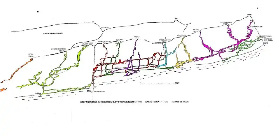 - ^ Martin Gerbaux; Jean Héraud; Pascal Collet; Gilbert Bohec (2008). "Le réseau du clot d'Aspres, un nouveau -1000 sur le Vercors" (PDF). Scialet (in French). Comité départemental de spéléologie de l'Isère. pp. 17–20. ISSN 0336-0326. Retrieved 2023-09-11.