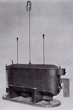 In 1903, the Spanish engineer Leonardo Torres Quevedo introduced a radio based control system called the "Telekino"[6] at the Paris Academy of Sciences. In the same year, he applied for several patents in other countries.[7][8] It was intended as a way of testing Astra-Torres airship, a dirigible of his own design, without risking human lives.[9] Unlike the previous mechanisms, which carried out actions of the 'on/off' type, Torres established a system for controlling any mechanical or electrical device with different states of operation. This method required a transmitter capable of sending a family of different code words by means of a binary telegraph key signal, and a receiver, which was able to set up a different state of operation in the device being used, depending on the code word. It was able to select different positions for the steering engine and different velocities for the propelling engine independently, and also to act over other mechanisms such an electric light, for switching it, and a flag, for raising or dropping it, at the same time,[10] and so up to 19 different actions.[11] In 1904, Torres chose to carry out the first test on a three-wheeled land vehicle with a range of 20 to 30 meters.[12] In 1906, in the presence of an audience which included King Alfonso XIII of Spain, Torres demonstrated the invention in the Port of Bilbao, guiding the electrically powered launch Vizcaya from the shore with people on board, which was controlled at a distance over 2 km.[13]
