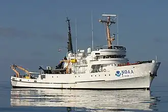 Operated by NOAA's Office of Marine and Aviation Operations after NOAA was established on 3 October 1970, David Starr Jordan supported NOAA's National Marine Fisheries Service Southwest Fisheries Science Center Laboratory in La Jolla, California. Dolphin population assessment in the eastern tropical Pacific Ocean was one of her longstanding missions, and she was an integral part of the marine mammal surveys conducted by the laboratory's Protected Resources Division, including the Stenella Abundance Research Project (STAR), a three-year study of dolphin stocks taken as incidental catch by the yellowfin tuna purse-seine fishery in the eastern tropical Pacific.[2][3] When assessing dolphin populations, she operated in cooperation with NOAA's MD 500 helicopter, which provided aerial photography support; from the photographs, scientists could measure the length of individual animals and count the number of dolphins in selected schools, which then could be used to calibrate estimates of the sizes of schools of dolphins made by observers aboard David Starr Jordan.[1] Data David Starr Jordan collected were critical in supporting the "dolphin-safe” tuna campaign and labeling requirements and led to a major reduction in dolphin mortalities related to the operations of the yellowfin tuna industry.[4]