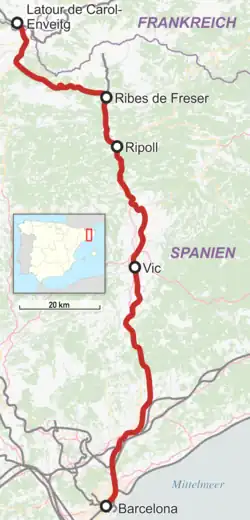 Together with lines R1, R2 and R4, the R3 (then simply numbered line 3) started services in 1989 as one of the first lines of the Cercanías commuter rail system for Barcelona, known as Rodalies Barcelona.[3] In 2010, after the administration of the Barcelona commuter rail service was transferred to the Catalan government, the line was extended from its original northern terminus at Vic to Latour-de-Carol-Enveitg.[4] The section north of Vic had not previously been considered part of the Barcelona commuter rail service; designated Ca5, the services running on it were part of Renfe Operadora's regional rail division in Catalonia.[5] In the long-term future, it is projected that the R3 will be rerouted through the Aragó Tunnel in Barcelona.[6] Furthermore, it is planned to be extended southwards to Castelldefels, thanks to the construction of a new branch line from Cornellà de Llobregat.[7]