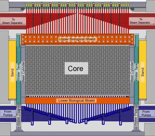 The reactor vessel has on its outer side an integral cylindrical annular water tank,[17] a welded structure with 3 cm thick walls, an inner diameter of 16.6 m and an outer diameter of 19 m, internally divided to 16 vertical compartments. The water is supplied to the compartments from the bottom and removed from the top; the water can be used for emergency reactor cooling. The tank contains thermocouples for sensing the water temperature and ion chambers for monitoring the reactor power.[18] The tank, along with an annular sand layer between the outer side of the tank and inner side of the pit,[14] and the relatively thick concrete of the reactor pit serve as lateral biological shields.